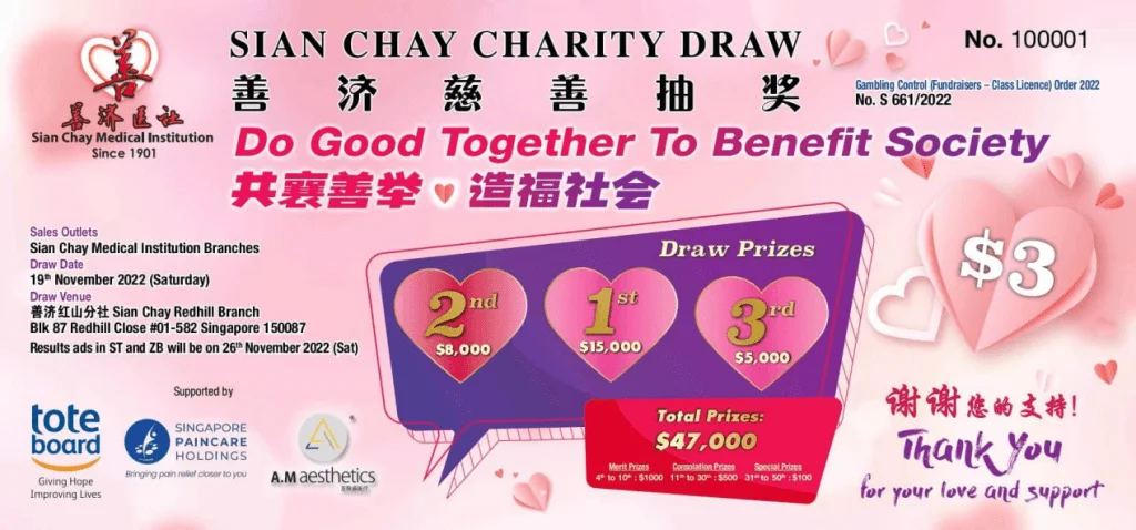抽奖结果将会公布在11月26日的《海峡时报》与《联合早报》。领奖的截止日期是12月31日。中奖者请拨电 6744 1891联系善济医社安排领取奖品。